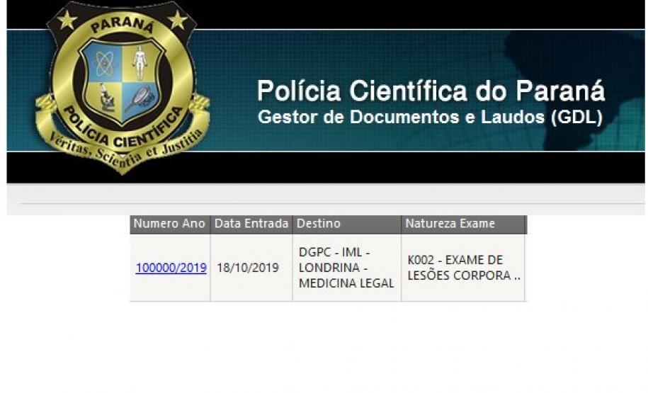 O Sistema GDL (Gestor de Documentos e Laudos) da Polícia Científica do Paraná alcançou pela primeira vez a marca de 100.000 registros de Requisições de Exames Periciais (REP) no ano. A REP de número 100.000 do ano de 2019 foi cadastrada no dia 18/10/2019 na unidade do IML de Londrina.